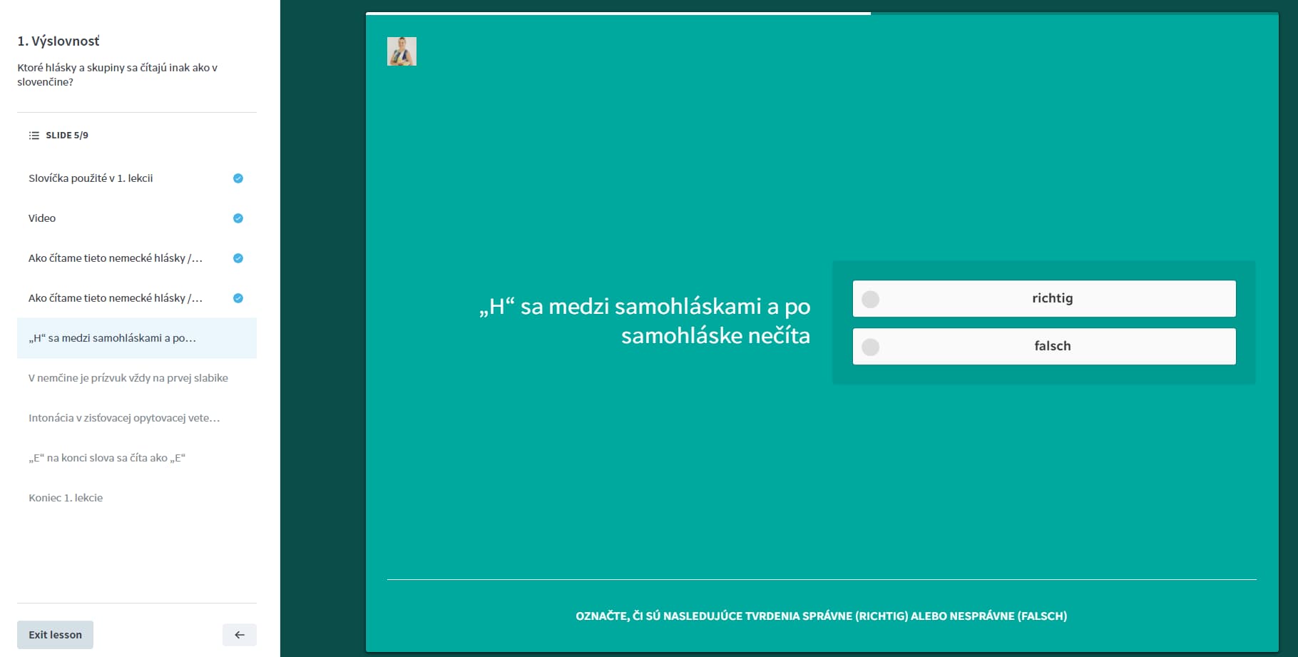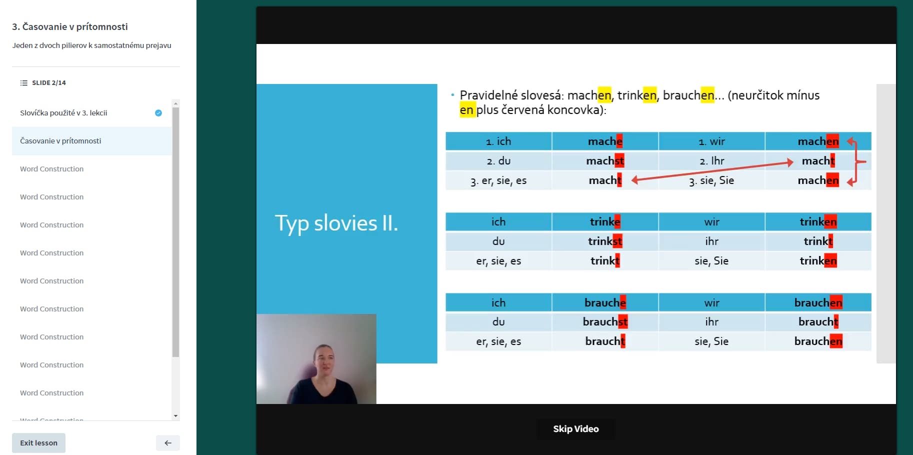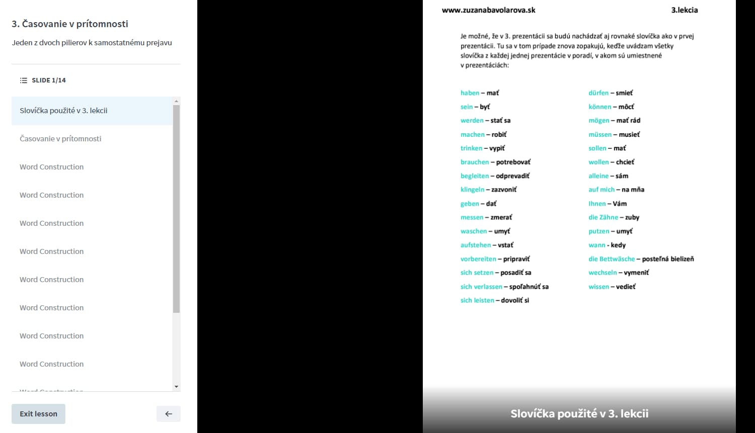 Každá lekcia obsahuje slovnú zásobu, video s prezentáciou a interaktívne úlohy so správnymi riešeniami.