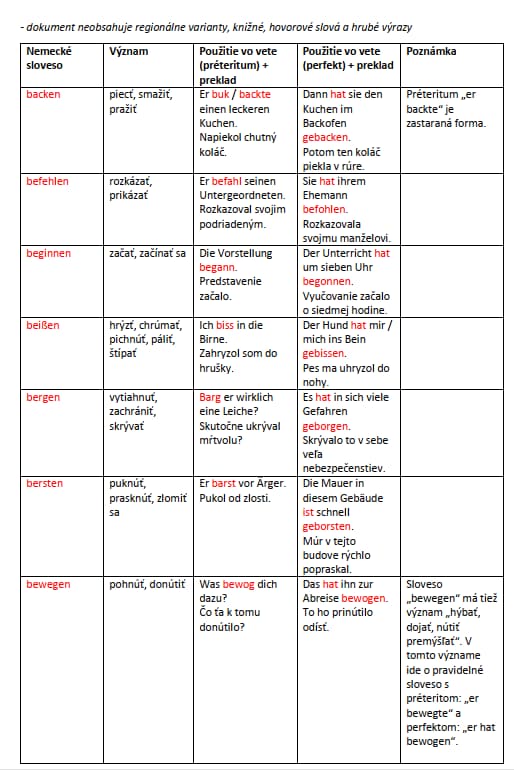 Tento unikátny súbor (30 strán) obsahuje nepravidelné slovesá uvedené v príručke s názvom "Deutsche Grammatik" od autorov G. Helbig a J. Buscha z roku 2001, str. 36-40. Každému slovesu som venovala maximálnu pozornosť s cieľom ponúknuť študentom viac ako je možné nájsť v prehľadoch nepravidelných slovies zväčša niekde na konci učebnice alebo slovníka... Informácie k slovesám som čerpala z elektronických slovníkov Lingea: https://slovniky.lingea.sk/nemecko-slovensky; Duden: https://www.duden.de/ a DWDS: https://www.dwds.de/.