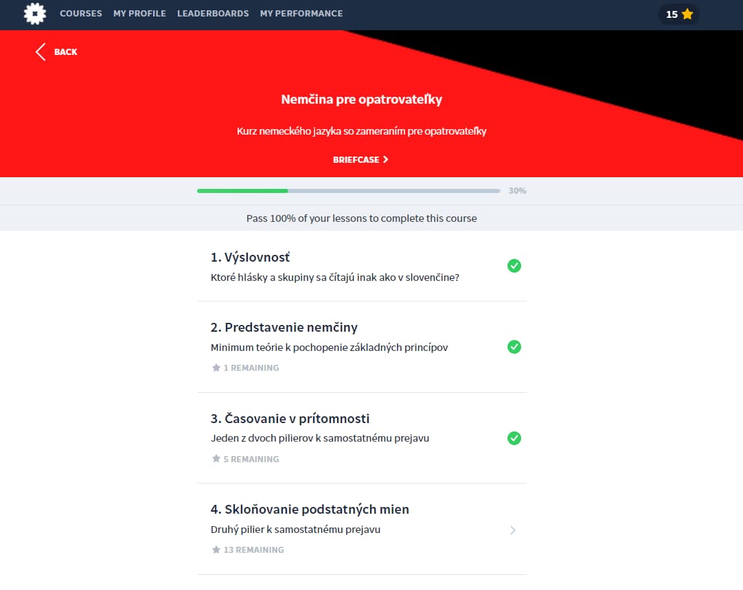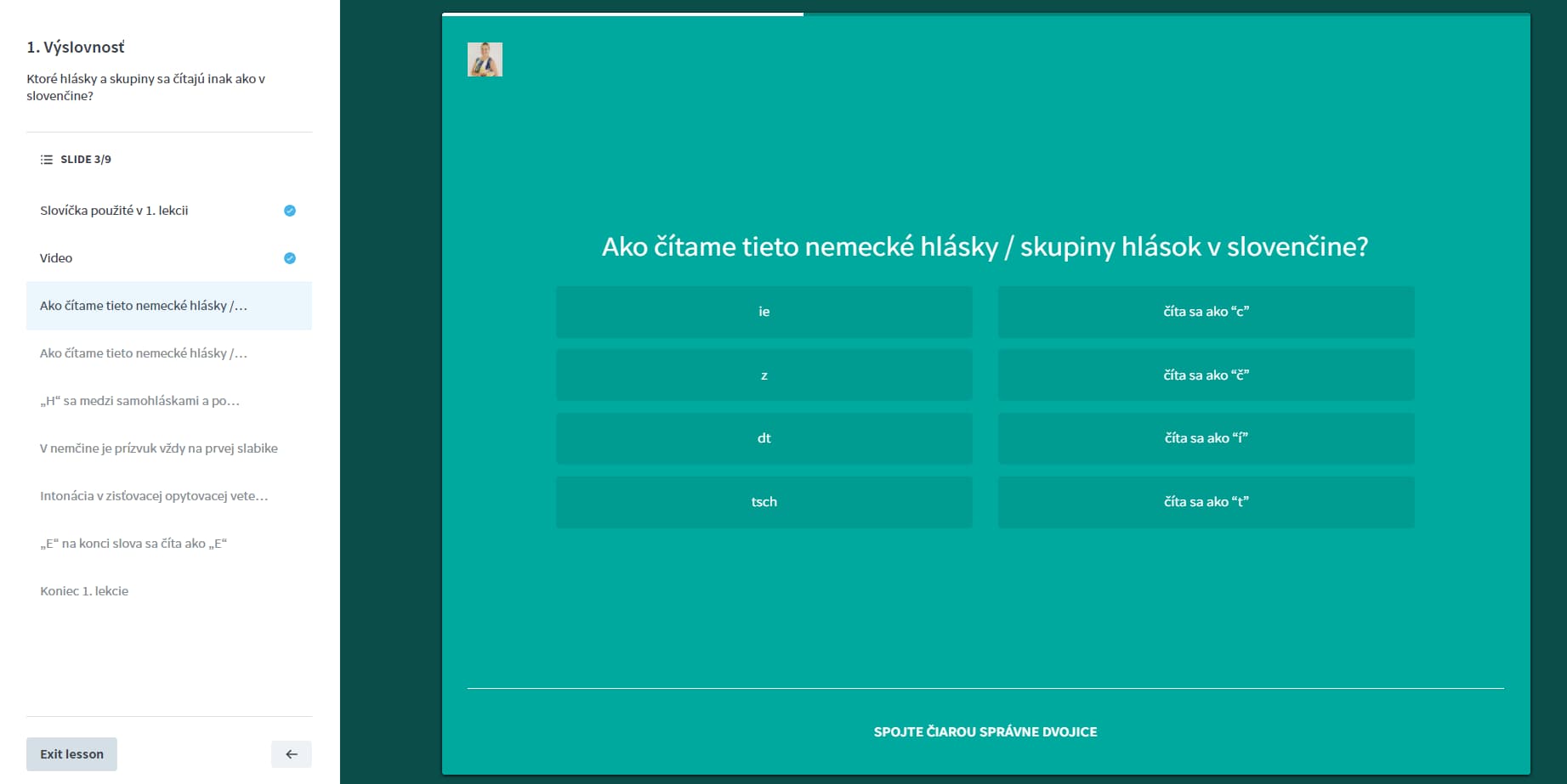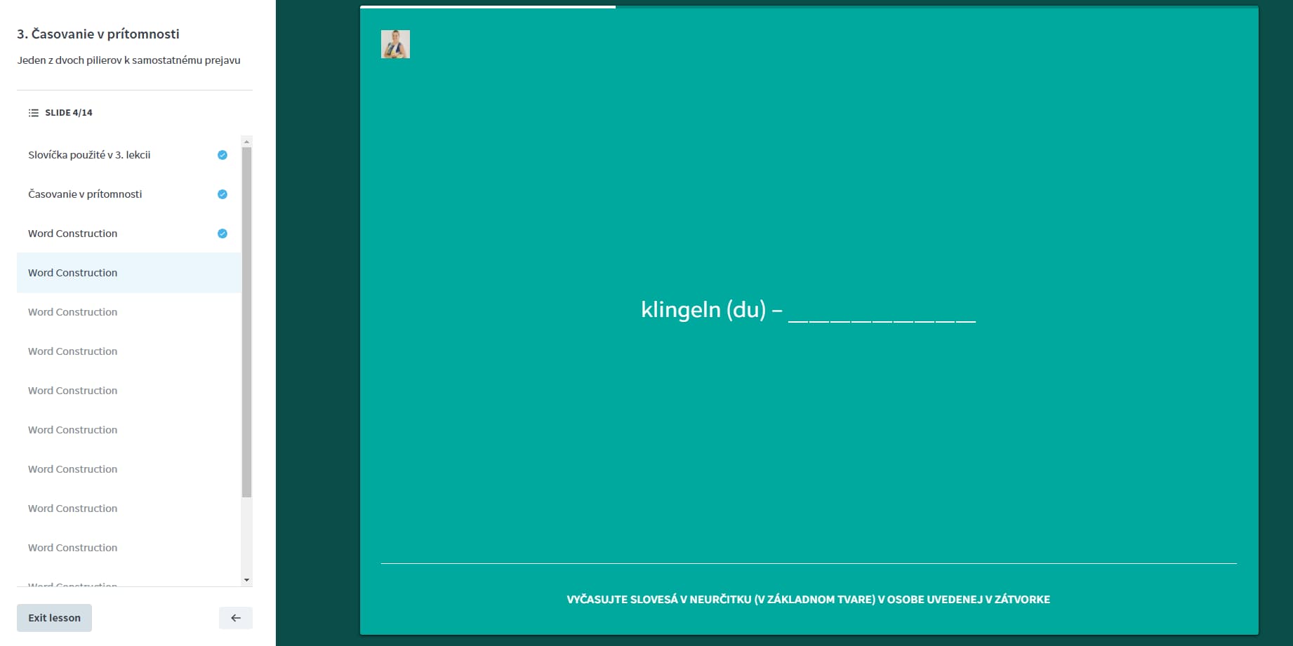 Každá lekcia obsahuje slovnú zásobu, video s prezentáciou a interaktívne úlohy so správnymi riešeniami.