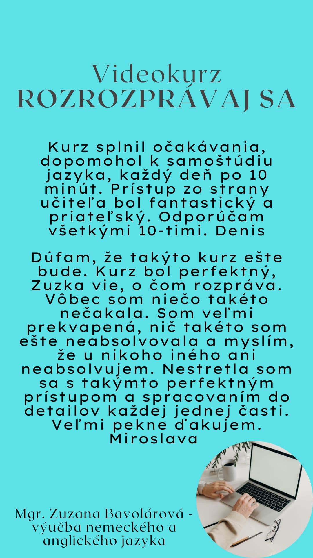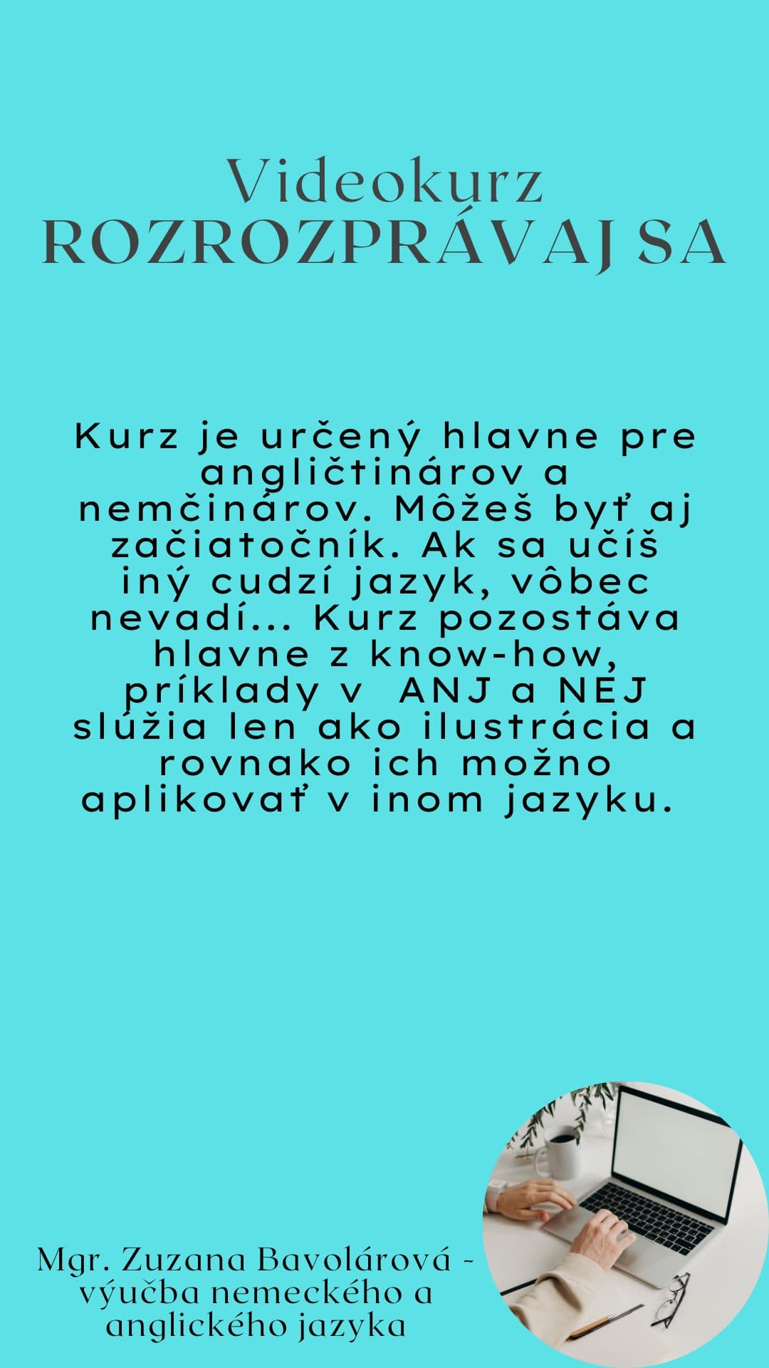Videokurz Rozrozprávaj sa predstavuje obsahovo nasýtený materiál, ktorý vychádza z potrieb praxe. Podkladom pre jeho vznik boli nielen teoretické vedomosti, ale predovšetkým praktické typy z mojich hodín angličtiny a nemčiny. Jednoducho povedané - v kurze prezentujem to, čo pomohlo už desiatkam mojich študentov a teraz môže pomôcť aj Vám v lepšom nácviku rozprávania v rôznych situáciách a s rôznymi komunikačnými partnermi.