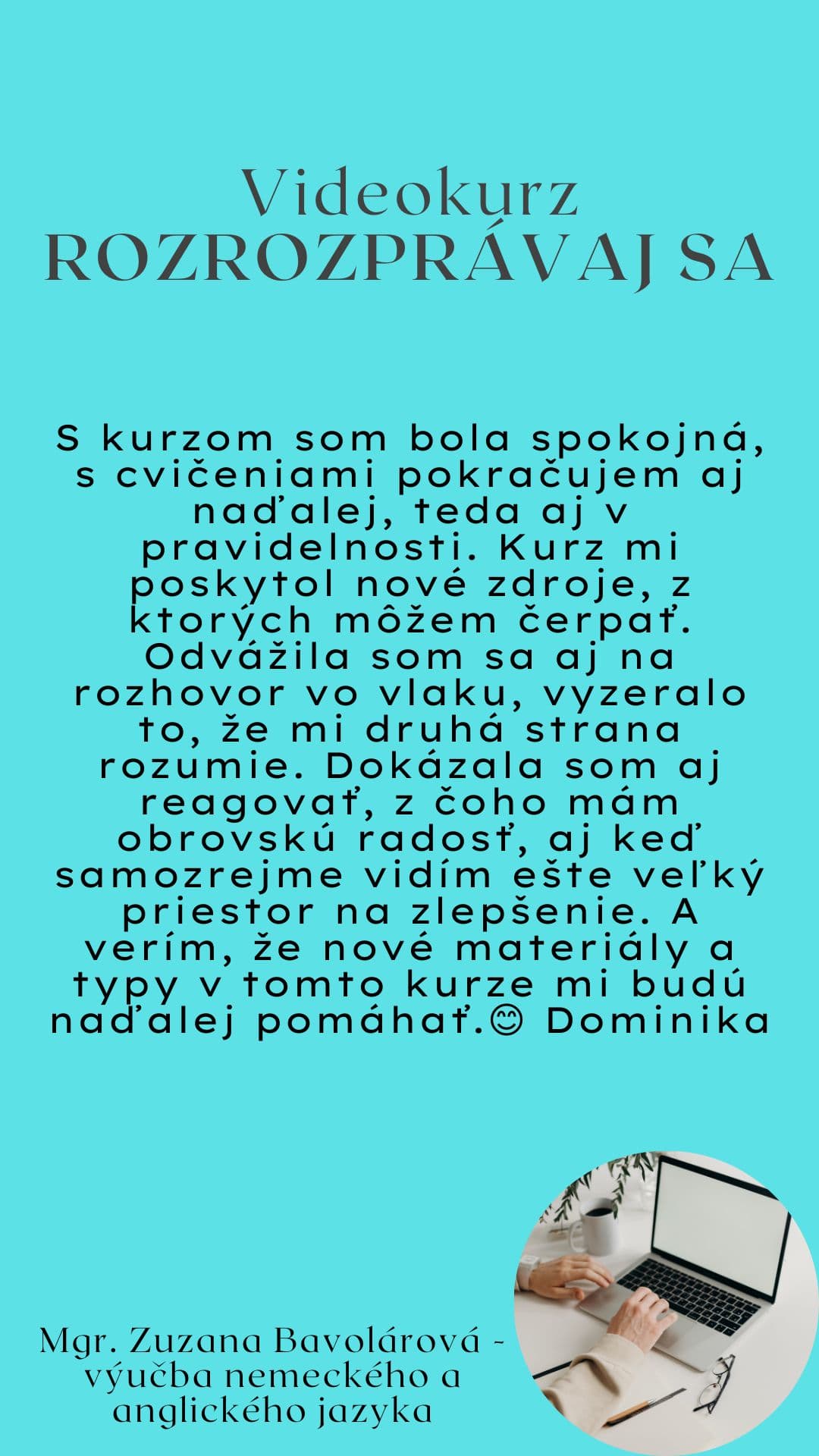 “Niekedy v júni som sa rozhodla, že už som počas korony prázdninovala dosť a pretože budúci školský rok maturujem, tak som si začala hľadať doučovanie nemeckého jazyka. Odpovedalo mi viacero učiteľov, no hneď som sa rozhodla pre pani Zuzku, nakoľko písala, že učenie cudzích jazykov je jej vášeň. Toto rozhodnutie som neoľutovala, lebo Zuzka je jedna fantastická učiteľka, na ktorej vidno, že učenie miluje a do hodín vkladá celé srdce. Vždy má pre mňa pripravenú tému, ktorú so mnou prejde a dokonca, keď ju nestíhame prebrať celú je ochotná sa mi venovať aj v mimoriadnom čase. Uvedomujem si, aké šťastie som mala, keď mi odpovedala na inzerát na doucma.sk. A som rada, že je ochotná vyučovať aj v online forme, nakoľko sa môžem učiť v pohodlí domova od naozaj výbornej učiteľky, aj keď vzdialenosť medzi nami je cca je 200 km. Všetkým, ktorí sa rozhodujú študovať cudzí jazyk prajem, aby si našli tiež takú sympatickú a super učiteľku akou je Zuzka a Zuzke prajem, aby jej láska k učeniu vydržala naveky.”